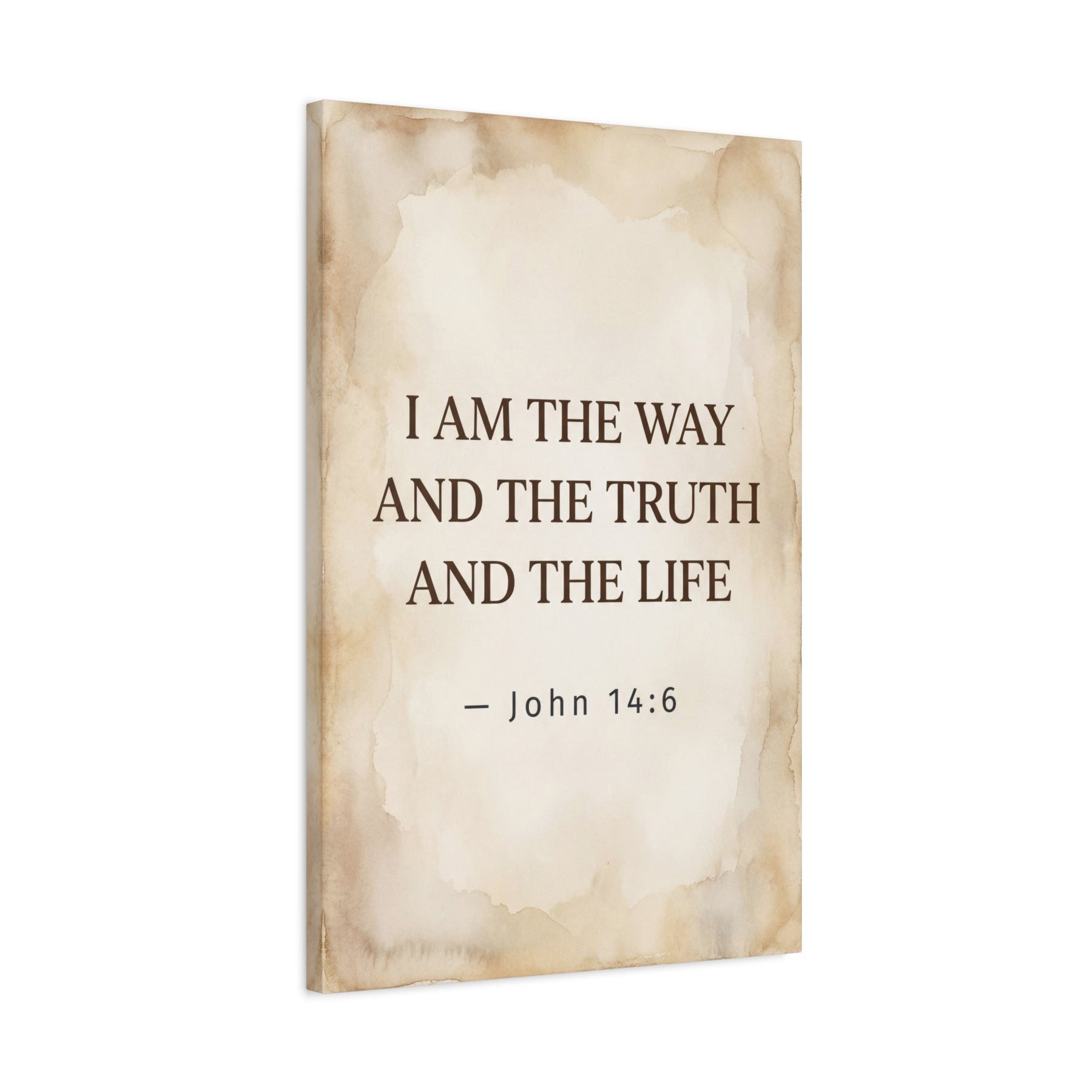 A quietly uplifting stretched matte canvas that brings a gentle, contemplative presence to any wall. Warm, watercolor-washed neutrals cradle the timeless verse, “I am the way and the truth and the life — John 14:6,” printed with high-definition clarity on a cotton-poly canvas. The soft, aged-paper look and simple serif type feel like a peaceful page turned up in a morning of quiet reflection. Lightweight but sturdy, the print arrives ready to hang and sits flush against the wall thanks to soft rubber supports and a slim pine stretcher. It blends easily into living rooms, entryways, or prayer corners, offering a subtle visual anchor during moments of gratitude and calm.